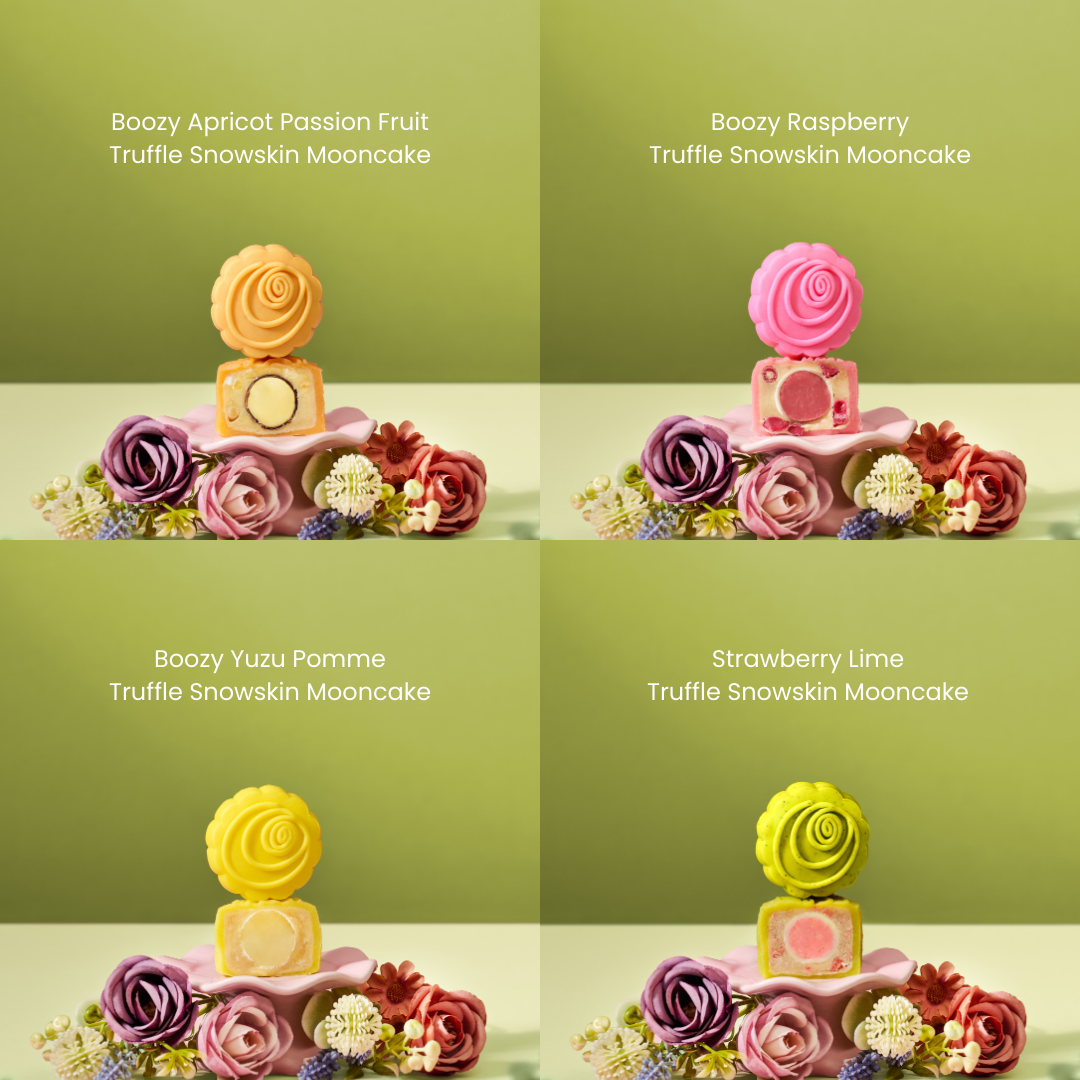 Each set contains 8 handmade Truffle Liqueur Snow Skin Mooncakes (2 of each flavour).